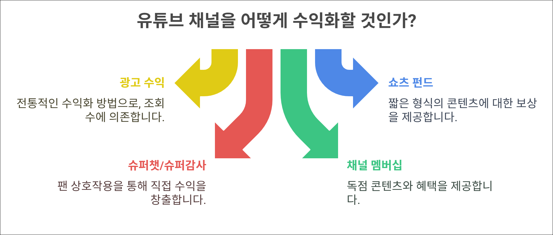 최근 유튜브는 Shorts 펀드, 슈퍼챗, 슈퍼감사, 채널 멤버십, 쇼핑 기능 등 여러 수익 창출 옵션을 제공하고 있으며, 콘텐츠 제작자들이 단순 광고 외에도 팬과의 상호작용을 통한 직·간접 수익을 얻을 수 있도록 구조를 점점 더 정교하게 만들고 있습니다.