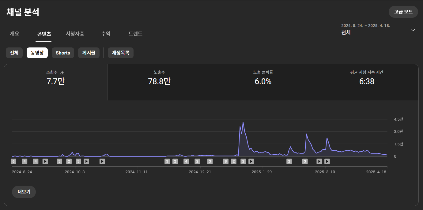 2024년 8월부터 2025년 4월까지 약 8개월 동안 누적된 총 조회수는 206만 회를 돌파했습니다. 이 기간 동안 유튜브에서 발생한 예상 수익은 약 $255.22, 우리 돈으로는 약 35만 원 수준입니다.