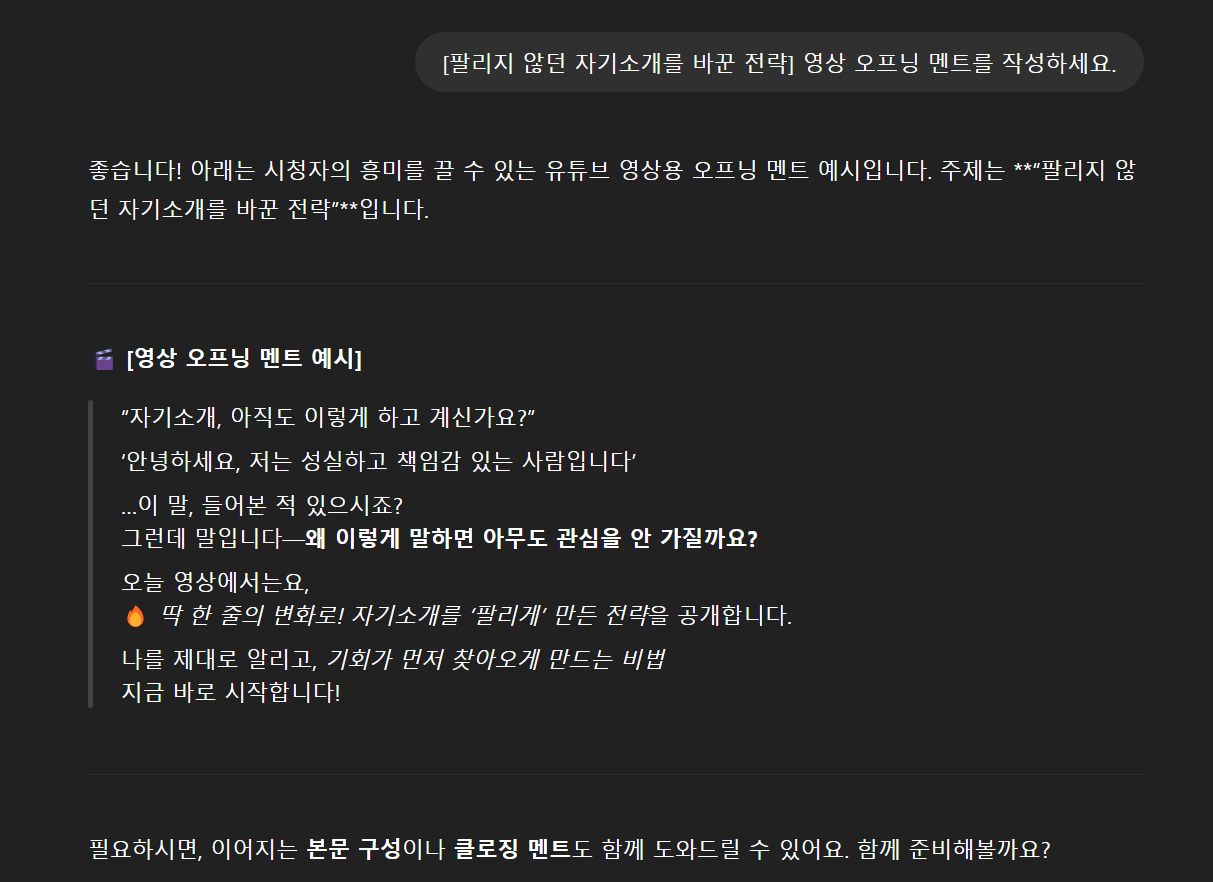 - [팔리지 않던 자기소개를 바꾼 전략] 영상 오프닝 멘트를 작성하세요.