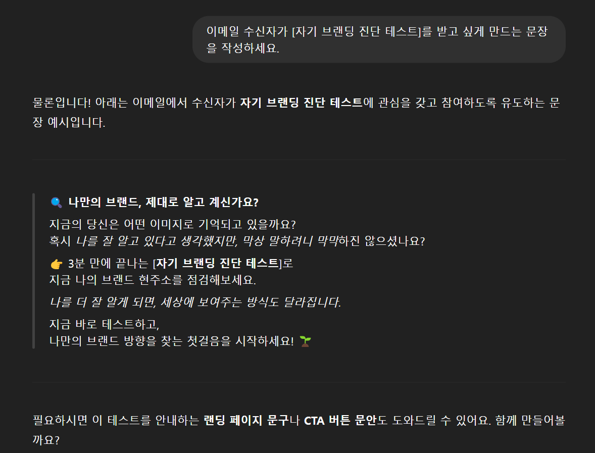 - 이메일 수신자가 [자기 브랜딩 진단 테스트]를 받고 싶게 만드는 문장을 작성하세요.